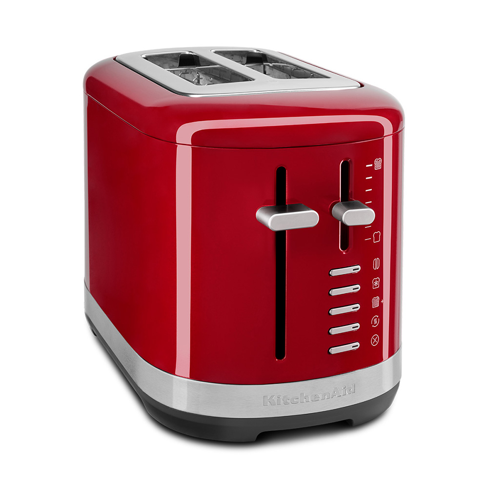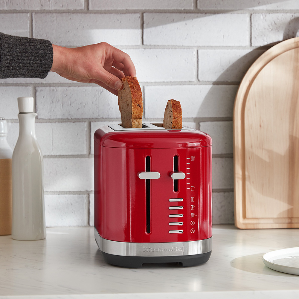 Esta tostadora de 2 rebanadas KitchenAid cuenta con ranuras extra anchas para tostar una gran variedad de formas y tamaños, incluyendo panes caseros o artesanales. Para mayor comodidad, el control de tono ajustable, de claro a oscuro, garantiza que tendrás tu tostada justo como te gusta. Está hecha para durar y su resistente diseño metálico añade estilo a tu encimera. ¿Qué incluye? Palanca de intensidad de tueste con 7 opciones Palanca de intensidad de tueste con 7 opciones Palanca de elevación manual 4 funciones adicionales – más versatilidad, más posibilidades Función «un poco más» Mantiene las tostadas con un nivel de calor bajo durante un poco más de tiempo. Función de recalentamiento Recalienta rápidamente alimentos tostados previamente. Función de descongelación Tuesta panes congelados en pocos minutos. Diseñada para tostar bagels a la perfección Reduce el calor en un lado para dorar ligeramente la parte exterior del bagel mientras se tuesta el interior. Botón de cancelación Cancela el ciclo de tueste en cualquier momento y eleva el pan para retirarlo.